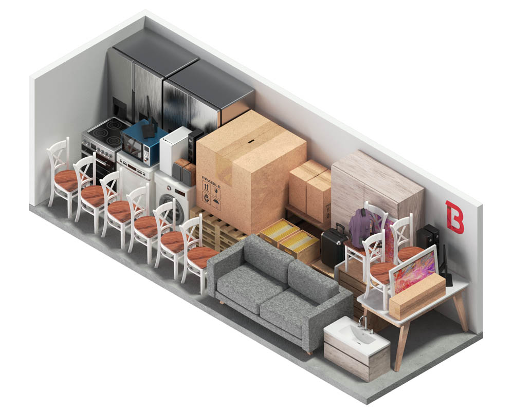 This large unit is roughly the size of a single-car garage and can fit the contents of a typical four-bedroom home. Great for stacking boxes, storing big furniture, or keeping bulky items, and perfect for business or office storage too.